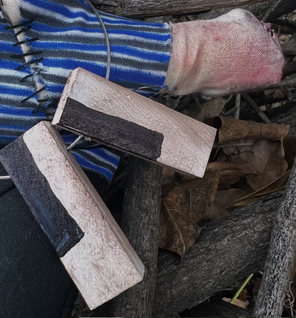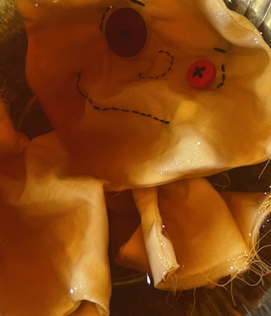 I always create a backstory for my zombies, and Schroeder was only able to salvage some piano wire and a couple of keys after the undead Great Pumpkin attacked! Halfway through construction - I decided to tea stain the muslin - that was a creepy sight!!